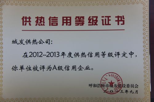 年度供熱信用等級(jí)評(píng)定中,呼市城發(fā)供熱有限責(zé)任公司被評(píng)為